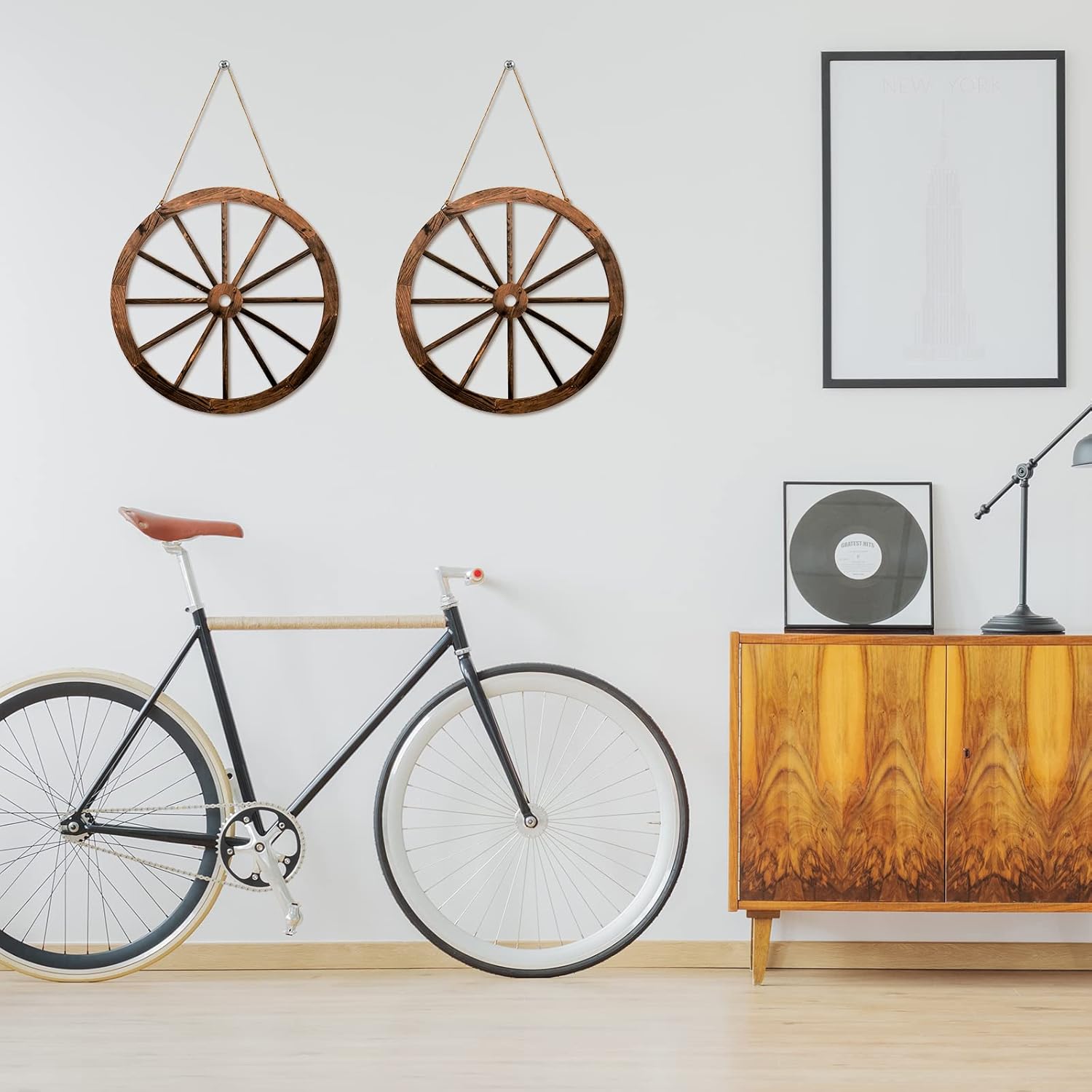 Easy to use: there is a triangular hook on the back of each rustic wagon wheel decor, so you can easily use it to choose wherever you want to hang without nails; At the same time, it is very thin and light, making it easier to install. Also the decors can keep harmonious with your house styles, which can bring refreshed feelings