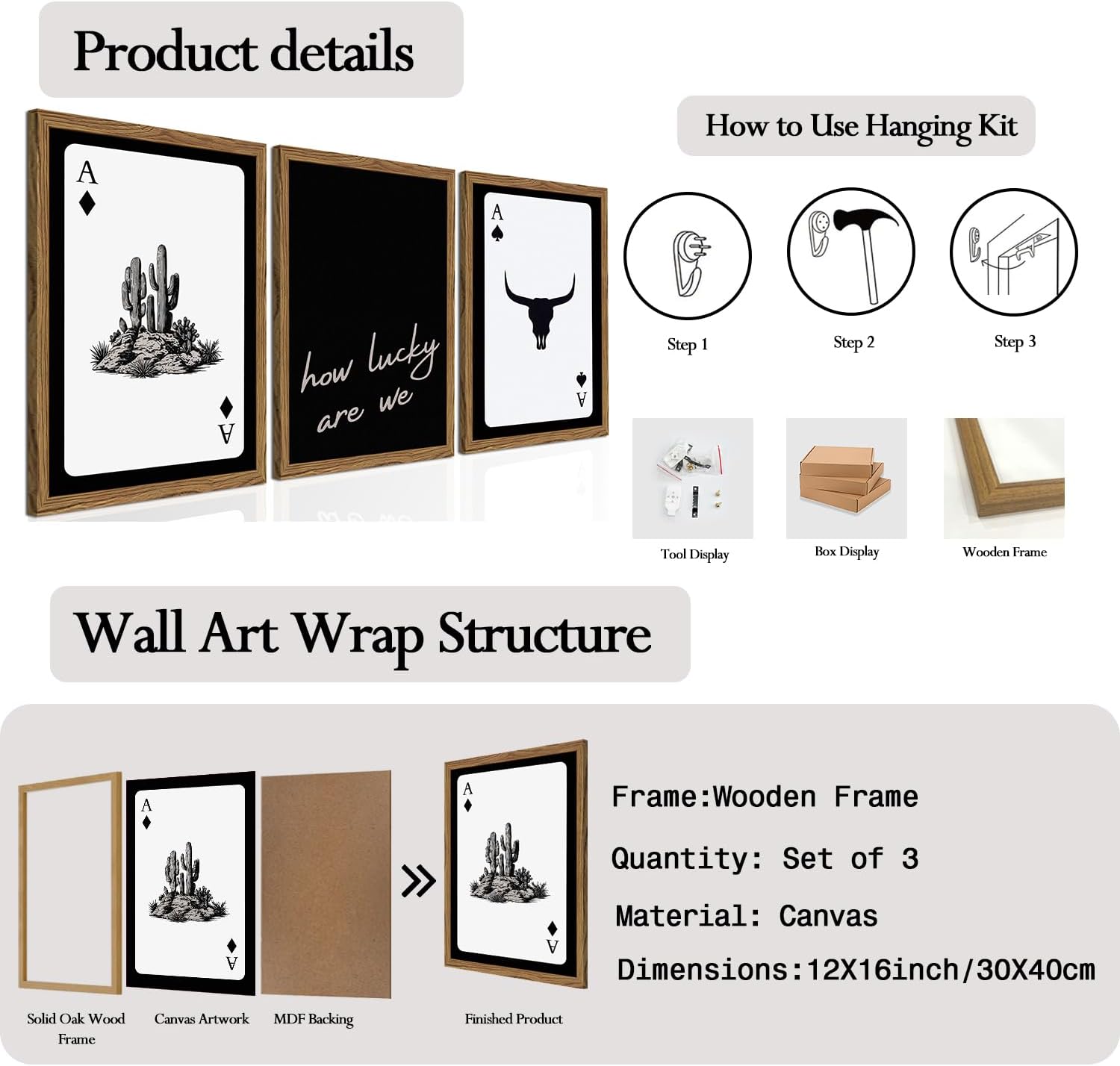 Western Wall Art Set of 3, Southwestern Cowboy Playing Card Wall Decor, Longhorn Bull Skull and How Lucky are We Poster Canvas Painting Prints for Bedroom Living Room 12×16 inch Wood Framed