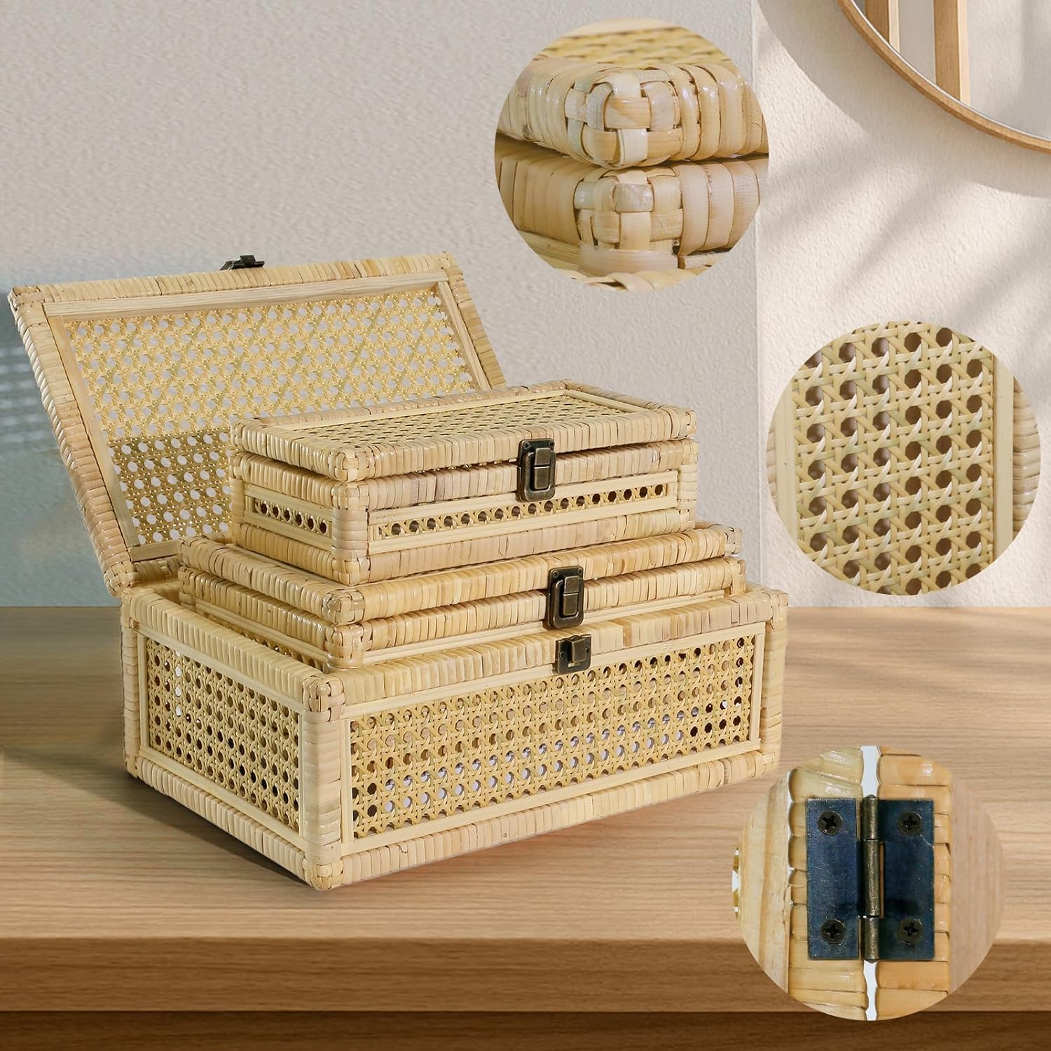 Decorative Boxes with Lids: Equipped with rattan lid, thoughtful design, protecting your cherished items from dust and damage. The lid is attached to the decorative box by a strong hinge