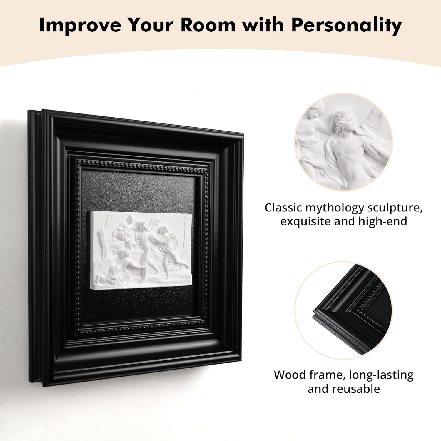 Premium Craftsmanship & Elegant Design – Expertly crafted from premium plaster, this high-relief sculpture showcases intricate details that bring the mythological scene to life. The contrast between the white carving and the deep black wood frame enhances its visual impact, making it a captivating wall décor.