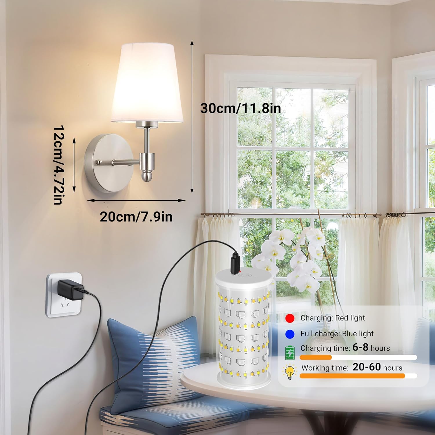 10000 mAh Detachable Rechargeable Bulb, Long Life: These battery operated wall sconces provide perfect indoor lighting with rechargeable RGB dimmable bulbs. Built-in magnets at the bottom of the bulb, easy to remove and charge. With USB charging port, no disposable batteries required. The long-lasting battery provides up to 20-60 hours of use time on a single charge. Please note: If you need to buy a replacement bulbs, you can search for ASIN: B0DJJ8L5LG to buy