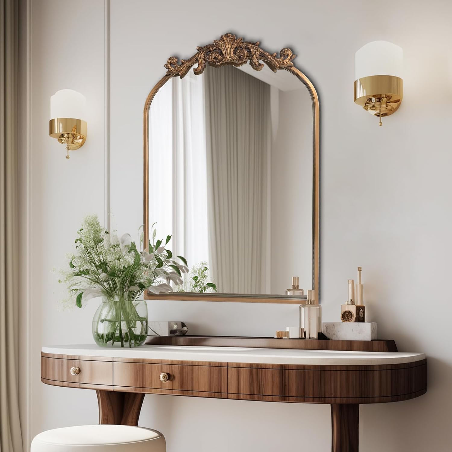 Wall Mirror Window Decorative Traditional Vintage Ornate Baroque Mirrors Antique Arched Farmhouse for Living Room Bedroom Entryway Bathroom Vanity (27 * 19 * 1.2, Gold)