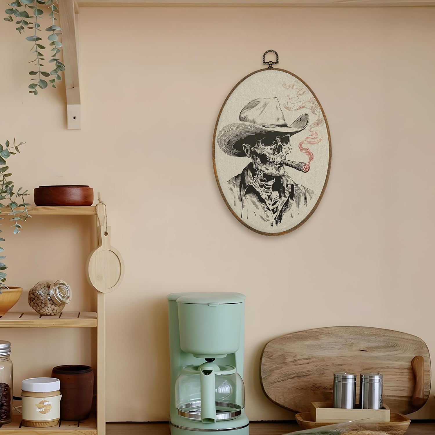 LKETW Gothic Western Cowboy Skeleton Oval Wall Art Decor, Vintage Western Oval Canvas Hanging Decor, Gothic Southwestern Smoking Skeleton Wall Decorations for Home Living Room Bedroom, 8.6×11.4 Inch