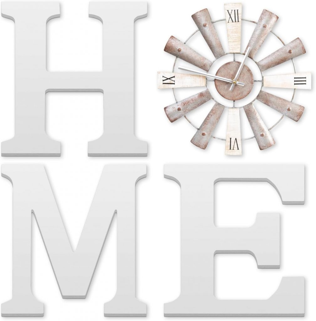 ZAZIWZ Farmhouse Home Signs with Windmill Clock Wall Decor Rustic Home Letters Wall Art for Living Room Kitchen Entryway Dining Room Bedroom (white)